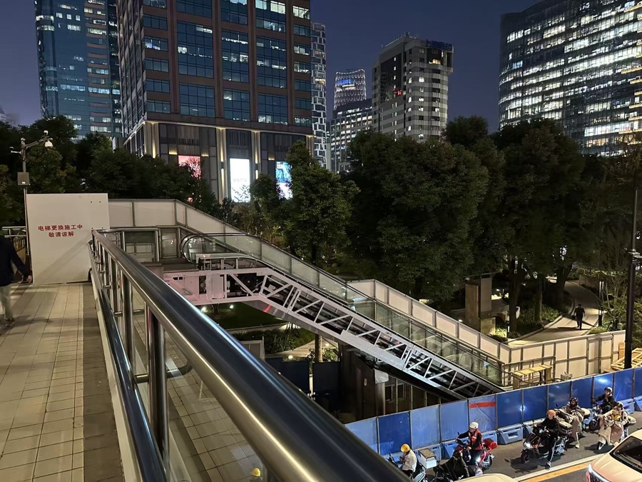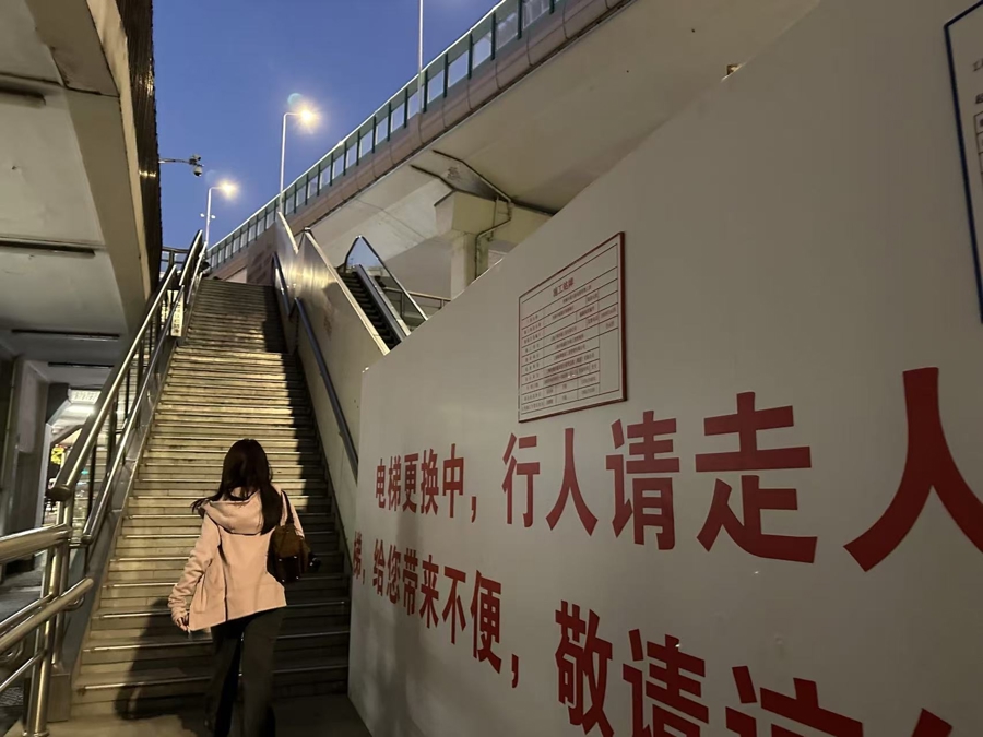 记者继续观察,天桥西南角一侧的自动扶梯被围挡起来,无法使用;天桥东南侧有两部自动扶梯,也都处于停运状态,一旁公告牌上写有“电梯更换施工中敬请谅解”字样。其中,一部扶梯出入口都被封闭,行人只能依靠旁侧的楼梯上下天桥;另一部更是完全“趴窝”,甚至还露出侧面的零部件。仅天桥西北侧的一处自动扶梯还在“正常服役”中。