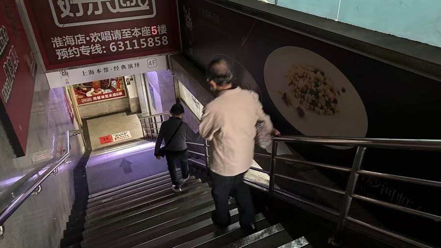 放眼看去,天桥的西北、西南、东北和东南四个方向均设有自动扶梯和升降电梯。其中,天桥西北侧与一栋名为“淮海中路地下停车库”的高楼相连,楼内一部升降梯直达二楼,与天桥桥面相连。不过,这部电梯却无法使用。要从这里上天桥,只能选择爬数十级楼梯。记者尝试爬楼,以一名成年男子的体力,爬完这30余级台阶,也颇为吃力。在爬梯过程中,只见一名老人一手扶着扶手,一手拄着拐杖,颤颤巍巍、小心翼翼地“逐级而下”。“原先,我出门后,从西北角由此上到天桥,乘坐轨道交通,前往淮海路等等。但自从3年前,商厦中的餐饮店撤离后,这部升降梯就被锁上停用了。”陈老伯慨叹,这30多级台阶,对他这样一位80岁的老年人来说,可谓是跨越“一道道坎”。
