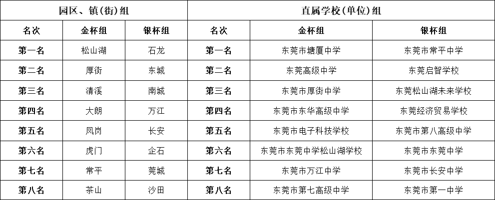 经过173场的激烈角逐,本次比赛最终决出各组别前八名。在园区、镇(街)组中,松山湖教育工会、厚街镇教育工会和清溪镇教育工会凭借出色表现,分获金杯组前三名;石龙镇教育工会、东城街道教育工会和南城街道教育工会则荣获银杯组前三名。直属学校(单位)组方面,金杯组前三名分别由东莞市塘厦中学工会、东莞高级中学工会和东莞市厚街中学工会获得;银杯组前三名则分别由东莞市常平中学工会、东莞启智学校工会和东莞松山湖未来学校工会获得。